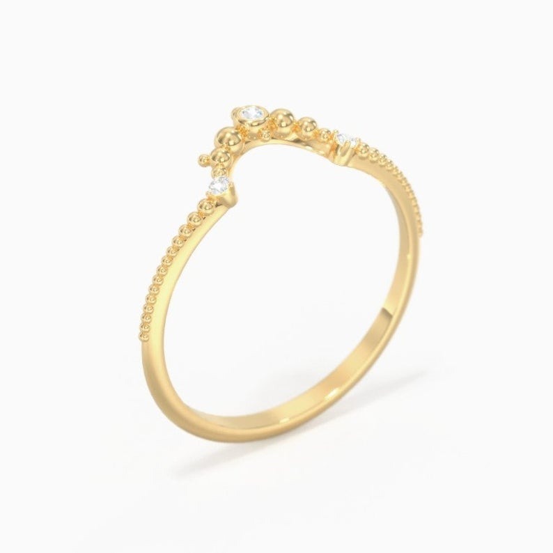 Round Cut moissanite gold ring, deep curved beaded band, half eternity band, Unique Engagement Ring, vintage ring gift for women, jewelry