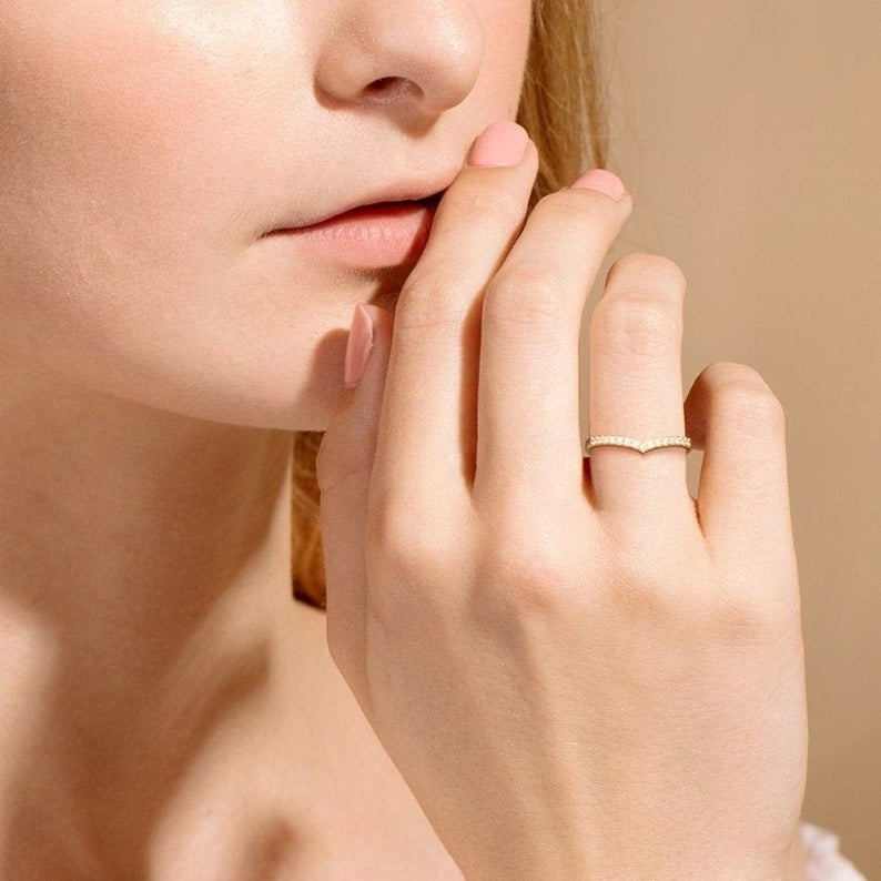 Round Cut moissanite Gold Ring/ stackable ring/ diamond Curved Wedding Band/ Chevron Ring/ Dainty Promise Ring/ engagement ring/ unique ring